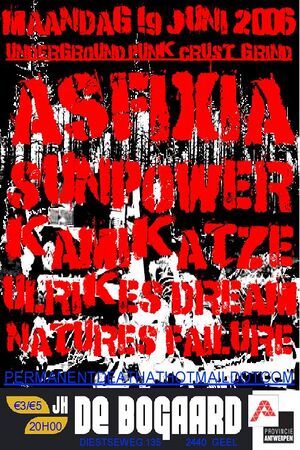 | Nederlands | Ulrikes Dream, Asfixia, Natures Failure, Kamikaze en Sunpower in De Bogaard in Geel op 19-06-2006 |