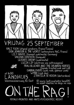 This event was a anti-psychiatric benefit with multiple female-fronted bands. Some bands had to cancel, but these bands actually played: Kali Yuga, Lily Havoc, Vagina Dentata, Ulrikes Dream, Lucia Lip, Ztratila se kocka (Engels)