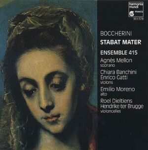 "Stabat Mater G. 532; kwintet op. 31 nr. 4 G.328\r\n\r\n\r\nAgn\u00e8s Mellon (sopraan)\r\nEnsemble 415: Chiara Banchini (viool), Enrico Gatti (viool), Emilio Moreno (altviool), Roel Dieltiens (cello), Hendrike ter Brugge (cello)" (Nederlands)